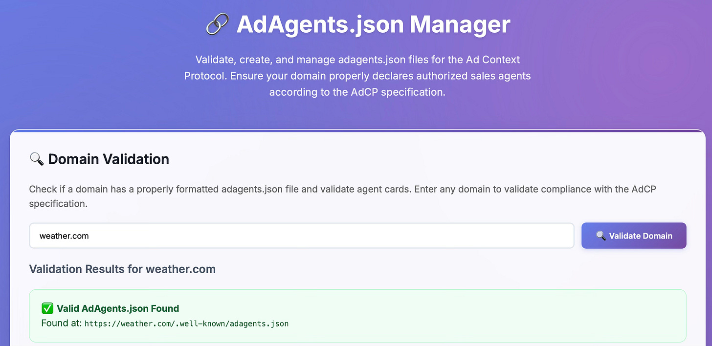 This provides clear provenance in both directions, answering both of the questions above. If you want to know if a sales agent represents a property, see if it’s mentioned in the adagents.json file. If you want to know which properties a sales agent represents, ask it… then verify by looking at the adsagents.json file for each publisher.